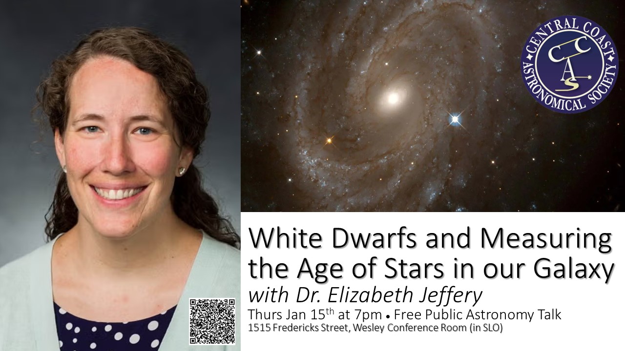 We are delighted to welcome Dr. Elizabeth Jeffery, Associate Professor of Physics at California Polytechnic State University, San Luis Obispo, where she teaches astronomy and astrophysics and mentors students in hands-on observational research. Thursday, January 15th at 7pmat 1515 Fredericks, San Luis Obispo Dr. Elizabeth Jeffery is an astronomer and [Read More...] |
