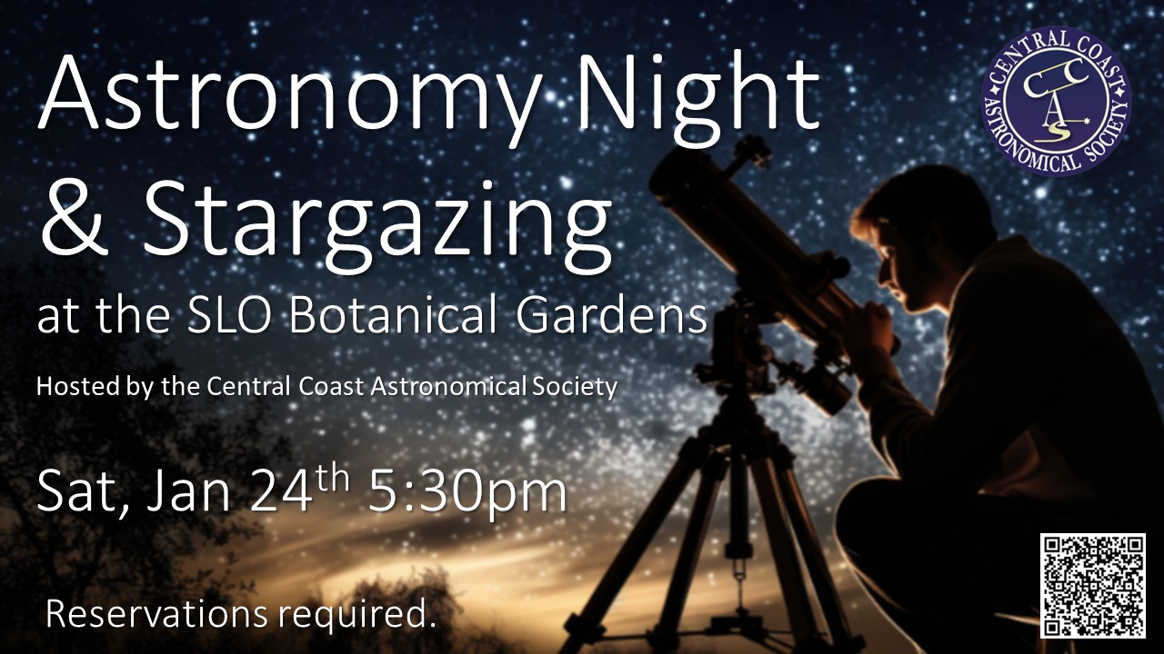Join us for an evening of stargazing at the SLO Botanical Garden. Explore the night sky with telescopes and guided viewing hosted by the Central Coast Astronomy Society. We’ll take a close-up look at Saturn’s rings, Jupiter’s cloud bands and moons, the Moon in brilliant detail, and deep-sky objects including Orion’s beautiful M42 Nebula. Whether you’re new to astronomy or a seasoned skywatcher, this is a fun and welcoming event for all ages. Reservations Required.