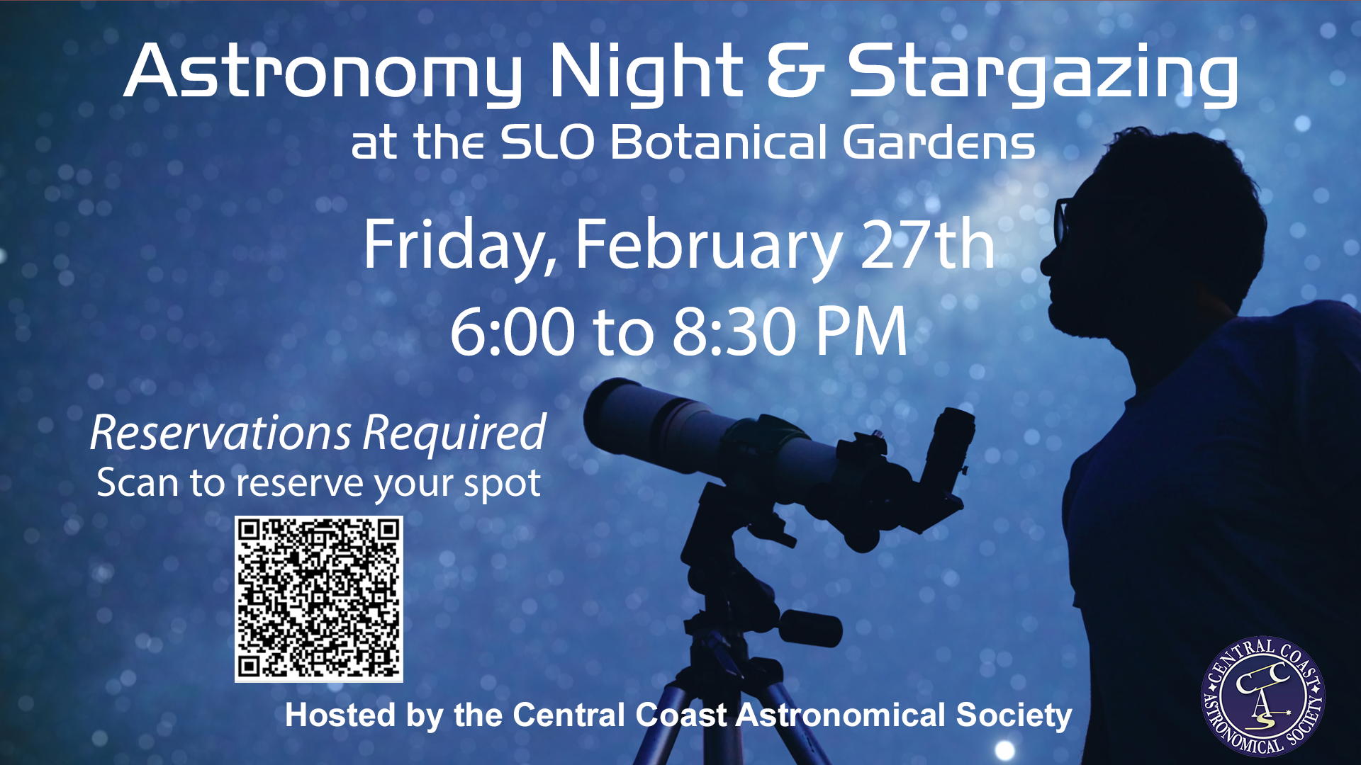 « All Events Stargazing in SLO at the Botanical Gardens February 27 @ 6:00 pm - 8:30 pm « Star Party – Santa Margarita Lake Park Star Party – Santa Margarita Lake Park » Add to calendar Google Calendar iCalendar Outlook 365 Outlook Live Details Date: February 27 Time: 6:00 pm - 8:30 pm Website: https://slobg.org/event/astronomy-night-stargazing-at-slo-botanical-gardens-with-central-coast-astronomical-society/ Venue SLO Botanical Gardens 3450 Dairy Creek Rd San Luis Obispo, United States + Google Map View Venue Website Organizer Central Coast Astronomical